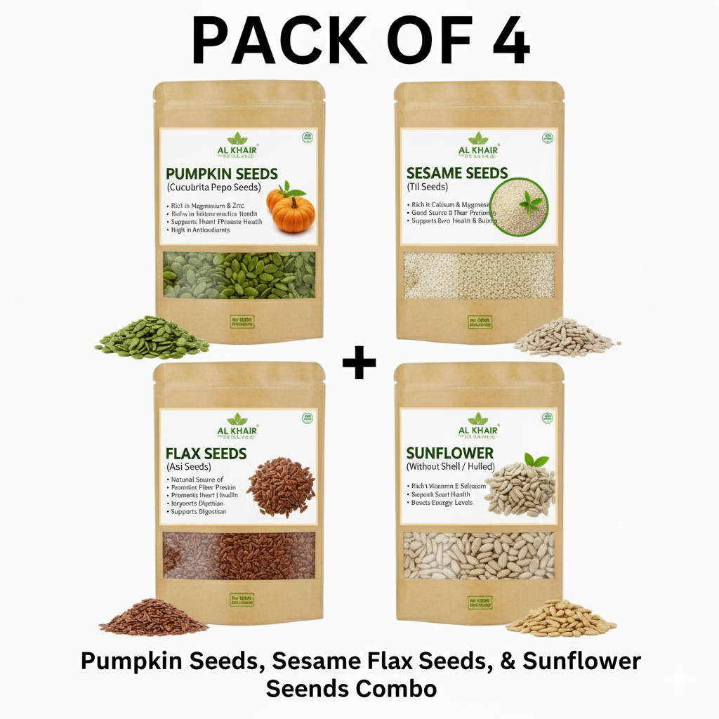 Enjoy the power of nature with Al Khair Herbals Pack of 4 Healthy Seeds β a perfect blend of nutrition, energy, and natural goodness. Each pack contains 100 grams of premium-quality Green Pumpkin Seeds, Sesame Seeds, Flax Seeds, and Sunflower Seeds (Without Shell), carefully selected and packed to retain freshness and taste.