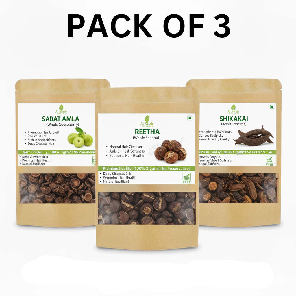 Al Khair Herbals Pack of 3 includes Sabat Amla, Reetha, and Shikakai (each 100g) — a perfect natural combo for strong, shiny, and healthy hair.